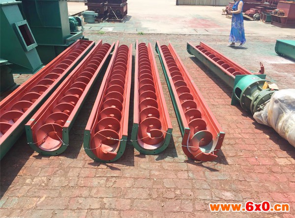 所以,物料在输送机中的运送,是一种滑移运动。为了使螺旋轴处于较为有利的受拉状态,一般都将驱动装置和卸料口安放在输送机的同一端,而把进料口尽量放在另一端的尾部附近。旋转的螺旋叶片将物料推移而进行输送,使物料不与螺旋输送机叶片