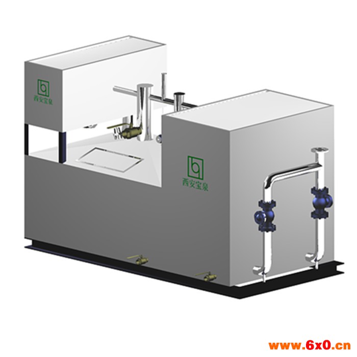 废水进入设备总进口,采用格栅兰和沉沙装置多重排渣分离杂物。废水进入油脂分离区,通过油水密度差原理,浮油吸到废油存储区,污水流到储水箱,再利用水泵提升排污,废油通过放油阀收集到废油箱。