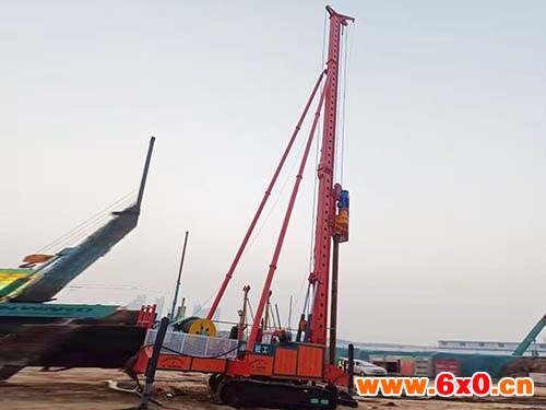 12米长螺旋钻机包括液压步履桩架和钻进系统两部分。桩架采用液压步履式底盘,自动化程度高,可自行行走及360度回转,长螺旋钻机设有四条液压支腿及一条行走油缸以辅助行走及回转同时增加施工时的整机稳定性,可整机进行转运。立柱为可折叠式箱型立柱,法兰连接方式,立柱采用两块高厚度锰板并且用大型折弯机折弯技术,经两道焊缝焊接而成同时立柱内部每隔60cm加焊四根加强筋固定,增加立柱抗扭抗弯性。立柱由两条变幅液压油缸控制其起降。钻进系统包括动力头与钻具,动力头的输出轴与螺旋钻具为中空式,桩机采用长螺旋成孔,可通过钻杆中心管将混凝土(泥浆)进行泵送混凝土CFG桩施工,即能钻孔成孔一机一次完成,也可用于干法成孔、注浆置换改变钻具后还可采取深层搅拌等多种工法进行施工。