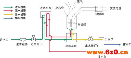 电极式蒸汽加湿器的电极与交流电源接通,电流从水中通过,电极通过水中的离子构成电流回路,随着时间的增加,水渐渐被加热蒸发,产生的蒸汽由蒸汽管道送至蒸汽扩散装置(喷杆或喷嘴)送入被加湿的空气中,从而达到了等温加湿的目的。蒸汽罐内的水位越高,电流越强,产生的蒸汽量越多。因此可以通过改变蒸汽罐内水位高低来调节加湿量。随着蒸汽量的不断输出,电极罐中的水位逐渐下降,这时电脑控制器将开启进水阀,给电极罐补充新水,满足所需要的加湿量要求。当加湿罐中的矿物质不断增多和水的电导率过高时,电脑控制器会自动打开排污阀,排掉部分水及污物,加湿器再次自动补水,从而确保加湿器工作在最佳状态和达到延长加湿罐寿命的目的。全程采用微处理器智能控制自动进水,自动排水,自动水位监测,循环放水。内部蒸汽压力不断增大,通过顶端蒸汽输送软管输出高洁净度的蒸汽,从而达到加湿的目的。