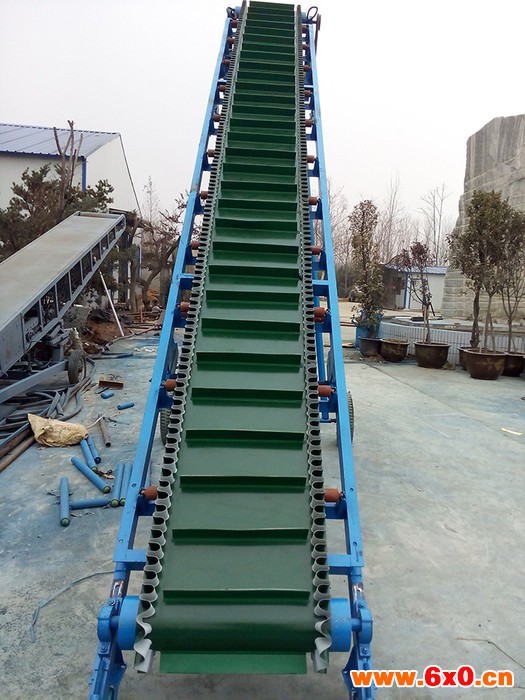 大倾角裙边输送机广泛用于、冶金、建筑、粮食、化工、电力等部门,具有通用带式输送机结构简单、运行可靠,维修方便等优点,还具有可大倾角输送,结构紧凑,占地少等优点。作为一般用途的散状物料连续输送设备,但由于其采用的是具有波伏挡边和横隔板的输送带,是大倾角(或垂直)输送的理想设备| 输送带 | 宽度mm | 厚度MM | 单价/米 | ||