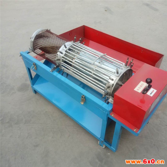 核桃脱壳机有机架、转子、钢刷子单相电机、入料斗、三角带轮及其传动三角带等组成。机具正常运转后,将核桃定量、均匀、连续地投入进料斗核桃在转子和刀片钢网的反复打击、摩擦、互力作用下,核桃轻松去青皮。