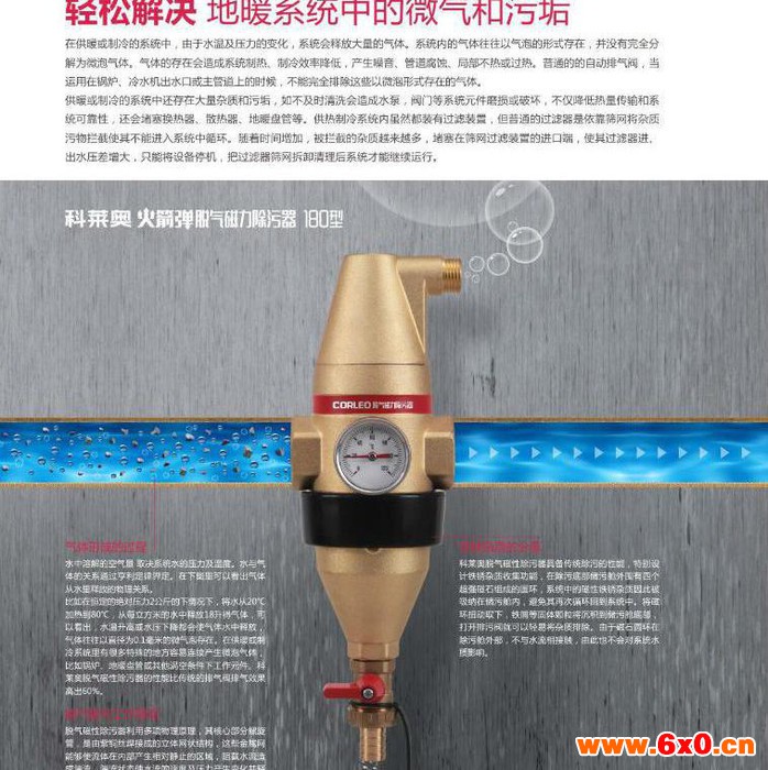 供暖或冷制的系统中还存在大量的杂质和污垢,如未能及时清洗会造成水泵,阀门等系列元件磨损花损坏,不仅降低热量传输和系统可靠性,还会堵塞换热器、换热器、地暖盘管等,致使供暖或制冷效果受到影响。大多数供暖系统内虽然都装有过滤装置,但普通过滤器是依靠筛网将杂质污物阻拦,使其不能进入系统中循环。随着时间的积累,被拦截的杂质越来越多,堵塞在筛网过滤装置的进口端,使其过滤器进出口水压差增大,只能将设备停机,把过滤器筛网拆卸清理后系统才能继续进行。科莱奥是解决微气和污垢的螺旋微泡排气阀。