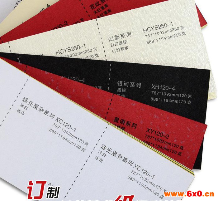 山东济南鑫雅特艺纸业是一家专业从事生产、销售特种纸张及加工为一体化的综合性工厂, 现有六台生产线设备:一台四色机、一台五色机、一台六色机、一台彩色瓦楞机、一台高速分切机、一台自动压纹机,花纹辊近90条。常年库存2000多吨、花色品种1000多个,也可来样定做加工。各种颜色、规格、克重及花纹可根据客户要求自由搭配。产品广泛用于**书刊、画册、楼书、精品礼品盒、酒盒包装;台历、挂历、服装吊牌等各个领域。 主要核心产品介绍: 珠光压纹系列:近90条花纹辊可选择,克重为:120g/150g/200g/250g/300g/350g 常年库存1000多个品种(含闪金闪银及幻彩系列)。 **商务印刷用纸系列:(近30条花纹辊可适应印刷) 涂布类—A:鑫雅美感 分为 米白/超白/高白 三个颜色 7个克重:115/145/180/215/250/315/330 月库存300吨左右(含787/889宽卷筒)。 B:鑫雅雪卡 分为 白色/米色 两个颜色 4个克重:180/215/250/300 月库存100吨左右(含787/889宽卷筒)。 未涂布类—A:鑫雅美雪 分为 超白/原白 两个颜色9个克重:80/115/135/150/180/225/260/300/350 月库存200吨左右(含787/889宽卷筒)。B:鑫雅美斯 米白色 6个克重:70g/80g/100g/120g/150g/200g 月库存100吨左右(含787/889宽卷筒)。 C:鑫雅美派 本白色 8个克重:80g/100g/120g/150g/180g/250g/300g/350g 月库存100吨左右(含787/889宽卷筒)。 彩色瓦楞纸系列:常年库存近60个颜色(正大度)。 **触感系列(天鹅绒):克重为 120g/250g/330g 常年备有库存5个颜色(白色/黑色/大红/酒红/咖啡)。 彩色描图纸系列:克重为 100g/180g 常年备有库存7个颜色。 **白卡系列:分为英国白/荷兰白 英国白克重:180g/250g/280g/330g 荷兰白卡克重:180g/240g/315g/380g **防**纸系列:克重140g 常年备有库存近100个颜色。 鑫雅纯木系列:近20条花纹辊、采用**长纤纯木浆抄造、具有色彩纯正、耐折度高等特点。