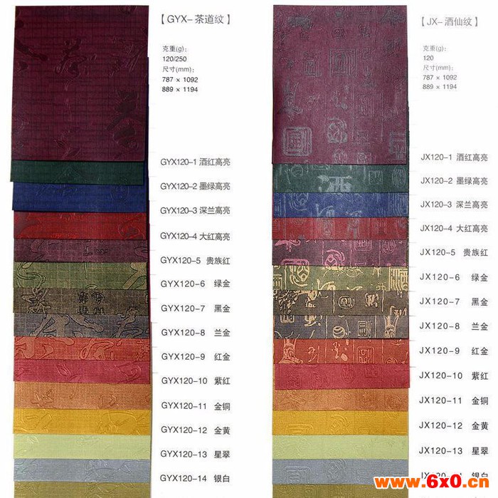 山东济南鑫雅特艺纸业是一家专业从事生产、销售特种纸张及加工为一体化的综合性工厂, 现有六台生产线设备:一台四色机、一台五色机、一台六色机、一台彩色瓦楞机、一台高速分切机、一台自动压纹机,花纹辊近90条。常年库存2000多吨、花色品种1000多个,也可来样定做加工。各种颜色、规格、克重及花纹可根据客户要求自由搭配。产品广泛用于**书刊、画册、楼书、精品礼品盒、酒盒包装;台历、挂历、服装吊牌等各个领域。 主要核心产品介绍: 珠光压纹系列:近90条花纹辊可选择,克重为:120g/150g/200g/250g/300g/350g 常年库存1000多个品种(含闪金闪银及幻彩系列)。 **商务印刷用纸系列:(近30条花纹辊可适应印刷) 涂布类—A:鑫雅美感 分为 米白/超白/高白 三个颜色 7个克重:115/145/180/215/250/315/330 月库存300吨左右(含787/889宽卷筒)。 B:鑫雅雪卡 分为 白色/米色 两个颜色 4个克重:180/215/250/300 月库存100吨左右(含787/889宽卷筒)。 未涂布类—A:鑫雅美雪 分为 超白/原白 两个颜色9个克重:80/115/135/150/180/225/260/300/350 月库存200吨左右(含787/889宽卷筒)。B:鑫雅美斯 米白色 6个克重:70g/80g/100g/120g/150g/200g 月库存100吨左右(含787/889宽卷筒)。 C:鑫雅美派 本白色 8个克重:80g/100g/120g/150g/180g/250g/300g/350g 月库存100吨左右(含787/889宽卷筒)。 彩色瓦楞纸系列:常年库存近60个颜色(正大度)。 **触感系列(天鹅绒):克重为 120g/250g/330g 常年备有库存5个颜色(白色/黑色/大红/酒红/咖啡)。 彩色描图纸系列:克重为 100g/180g 常年备有库存7个颜色。 **白卡系列:分为英国白/荷兰白 英国白克重:180g/250g/280g/330g 荷兰白卡克重:180g/240g/315g/380g **防**纸系列:克重140g 常年备有库存近100个颜色。 鑫雅纯木系列:近20条花纹辊、采用**长纤纯木浆抄造、具有色彩纯正、耐折度高等特点。