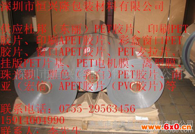 深圳市恒兴隆包装材料有限公司主要产品有:PET胶片、APET胶片、PVC胶片、PP胶片、PETG胶片、GAG胶片等、三层片、透明片、耐寒片、防雾片、防静电片、导电片、滑爽片、颜色片、等各类片材。规格:厚度:0.012-1.5MM、宽度:1-3300MM. 长度可按贵司要求分切。