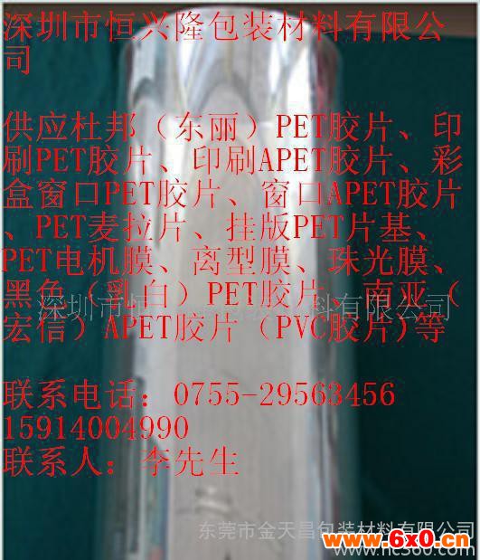 深圳市恒兴隆包装材料有限公司主要产品有:PET胶片、APET胶片、PVC胶片、PP胶片、PETG胶片、GAG胶片等、三层片、透明片、耐寒片、防雾片、防静电片、导电片、滑爽片、颜色片、等各类片材。规格:厚度:0.012-1.5MM、宽度:1-3300MM. 长度可按贵司要求分切。