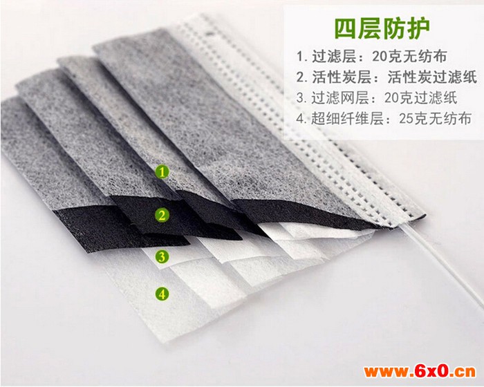 一次性加厚活性炭口罩共四层,采用活性碳纤维等高新技术材料,用熔化压缩方法,由外面两层无纺布内夹一层超细熔喷滤纸、一层高效活性碳布组成,附带有定型鼻夹,挂耳式,防尘率达到95%,可有效阻隔空气中的微粒飘尘,吸附各种工业废气如苯、氨气等,减低有害气体对人体呼吸系统的伤害。