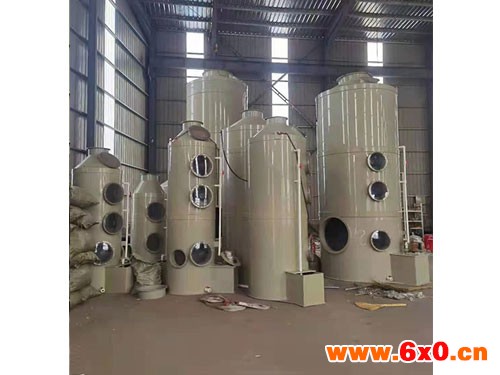 PP水喷淋塔具有结构简单、能耗低、净化等特点,能地去除气体(HCl)、氨气(NH3)、硫酸雾(H2SO4)、铬酸雾(CrO3)。水溶性气体,如氰化氢气体(HCN)、碱蒸气(NaOH)、硫化氢气体(H2S)和甲醛(HCHO)。酸雾废气通过风管进入净化塔,并通过填料层。废气与氢钠吸收液通过气液两相充分接触,吸收中和反应,对酸雾废气进行净化,再由除雾板脱水除雾。风扇被排放到大气中。水泵对塔底加压后,将吸收液喷到塔顶,再返回塔底循环使用。净化后的酸雾废气符合排放标准。