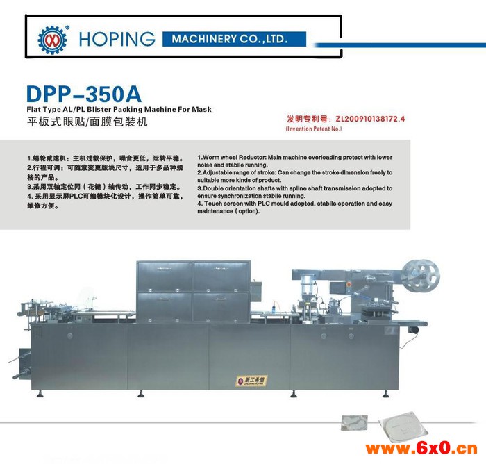 本公司生产的DPP-350M型铝塑自动泡罩面、眼膜机,采用变频调速与机、电、光、气一体化自动控制技术并严格按医药行业“GMP”标准要求进行创新设计。该机型具有光电眼自动光电泡孔对版、行程范围广、整机分体组合、工位结构模块化等诸多功能,属我公司第六代产品。该机型经过本公司不断改进、更新,使其综合性能达到国内**水平,有关技术填补了国内空白,与进口设备比较更具实用性和经济性。