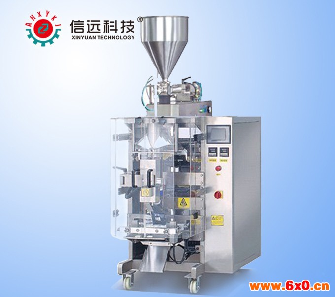 XYG-L系列全自动酱料包装机适用于各类酱体、酱料、调味料、油料等全自动计量包装封口,可自动完成定量灌装、折边制袋、包装封口、打印批号、生 产日期、加易撕口、切断或联体袋、产品计数等整套自动包装流程;采用气动柱塞泵容积法计量方式,特别适用于封口包装易拉丝及滴漏的产品物料;该包装机可以 包装500克至10公斤范围物料。袋长可以任调,当要包装多种包装规格,袋宽不定时,可以根据袋子的包装规格及重量,购置多套不同包装规格的成型器,配合 不同的物料输送泵。能够实现物体在高温状态下的自动定量充填包装,能有效的提高生产效率,避免因细菌入侵而造成的二次污染。该包装生产设备凝聚我公司多年 来在自动包装行业的成功技术经验,汲取大量用户的宝贵意见建议,不断完善更新并批量生产达到国内先进水平的全自动酱料包装生产设备。该机具有计量精度高, 包装速度快,无封口污染、防物料灌装拉丝滴漏、袋型美观等特点。